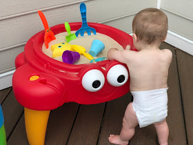 Tatum is a summer baby - we've been highly enjoying the fact that summer is here - afternoons at the pool and playing on the deck. Over the weekend we finally got his water table and sand table set up... we have a little baby pool that he loves to splash in too. I think playing with these will be part of the daily routine now as he has so much fun doing it.
